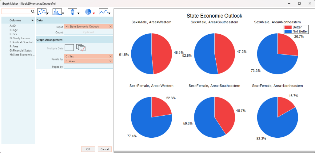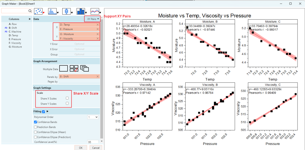 Отдельного внимания заслуживает обновлённая логика работы с расположением графиков. Graph Maker позволяет разделять переменные на отдельные слои или даже формировать из них независимые графики, что даёт больше контроля при сравнении нескольких показателей. Если данные содержат группирующие факторы, инструмент умеет автоматически разбивать графики на панели, что упрощает анализ подгрупп, сравнение трендов и оценку влияющих факторов.