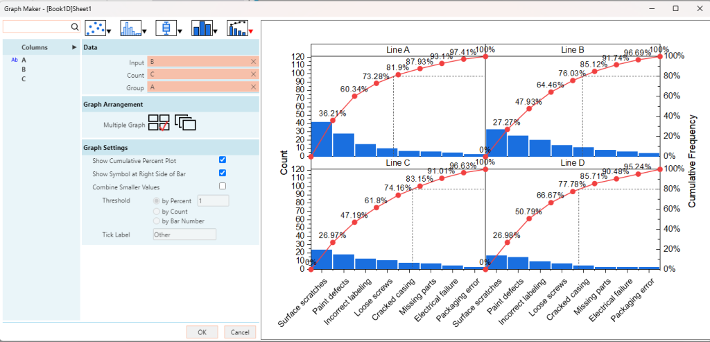 Главное изменение заключается в расширении набора поддерживаемых графиков. Для непрерывных данных стали доступны Probability Plot, Q–Q Plot, графики кумулятивного распределения (CDF) и Run Chart. Это существенно облегчает исследование формы распределения, проверку предположений о нормальности, поиск выбросов и анализ поведения данных во времени. Для категориальных данных тоже появились новые возможности: теперь можно строить круговые диаграммы и диаграммы Парето непосредственно в Graph Maker, что особенно полезно при анализе частот и выявлении ключевых категорий.